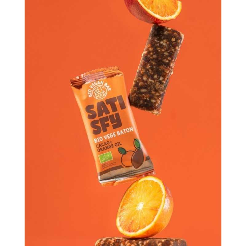 Bio Vegan Bar SATISFY is based on organic date paste with organic cocoa, almonds, agave syrup and orange oil. The product is 100% vegan, perfect for vegan and vegetarian diets. The bar is the perfect snack when traveling, at work or at school.