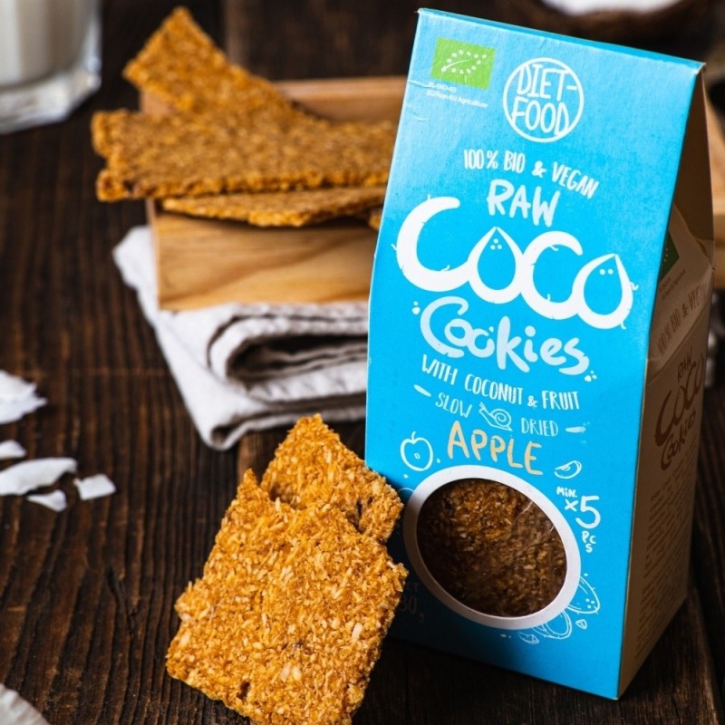 RAW Coco Cookies are delicious cookies based on coconut flakes with the addition of fruit. You will find only ecologically certified ingredients that have been dried in RAW temperature (42˚C) so that you can eat a wholesome and healthy snack. In addition, the cakes are made using methods that are important to us: by hand and dried at low temperature. They are a perfect snack for children and adults during the day, on the road or at work. What does the green leaf on the packaging mean? The green leaf logo on the packaging of our Diet-Food cookies means that the product is ecological. The ingredients that are in its composition come from certified organic farming without the addition of pesticides and are not genetically modified, their taste is 100% natural. What is "RAW" technology and what does it mean for me? Our product is RAW, which means that in the production process we used the drying process at a temperature not higher than (42˚C), maintaining the maximum nutritional value. Country of origin: Poland