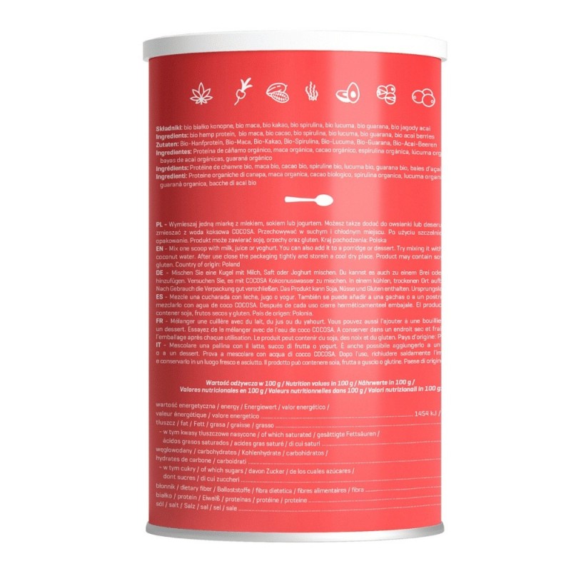 Our Super Sport Mix is a 100% natural and organic product. All its ingredients have ecological certificates. Hemp protein is a great vegetarian and vegan alternative for athletes. Maca, thanks to the content of antioxidants, helps in faster regeneration after training. Guaranine, present in guarana, stimulates the brain and body to exercise more powerfully and effectively than caffeine.