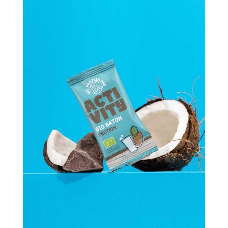 Bio batonik ACTIVITY powstał na bazie bio pasty daktylowej z kakao, migdałami, kokosem, baobabem i bio białkiem z serwatki. Batonik stanowi idealną przekąskę w podróży, pracy lub szkole.