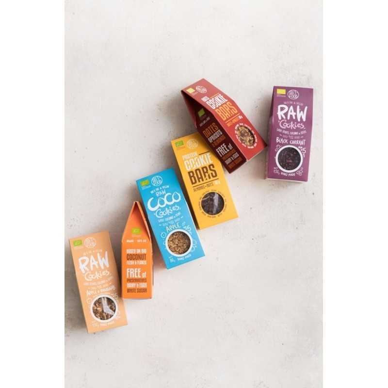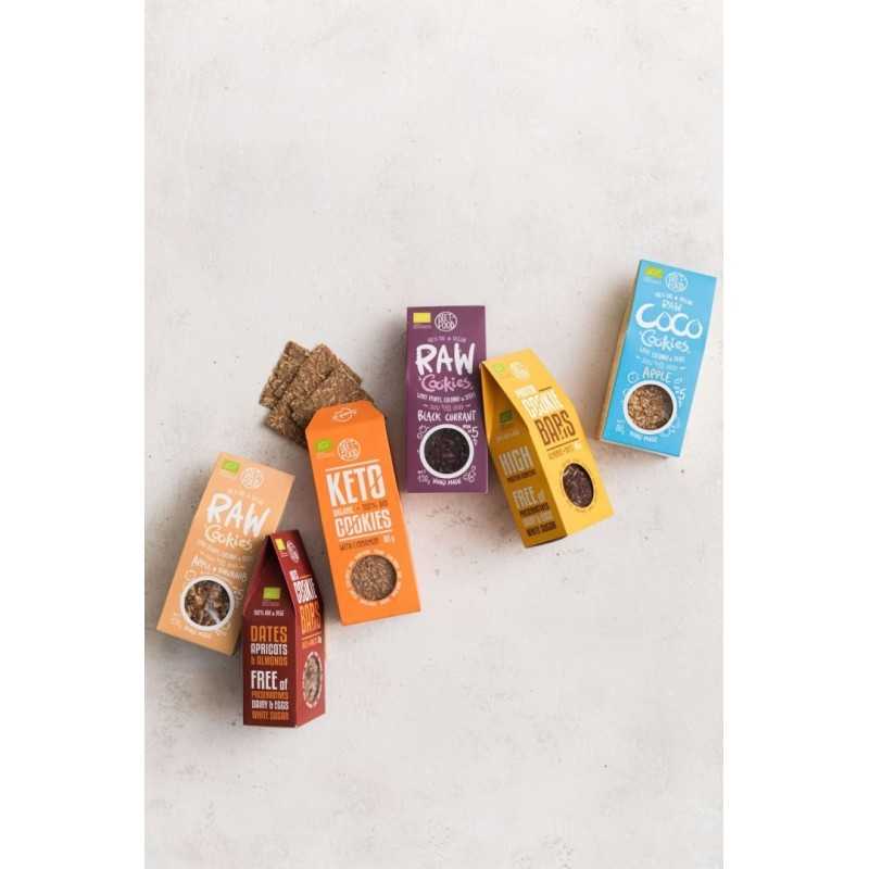 Nasze ciasteczka zawierają tylko naturalne bio składniki, nie ma w nich nic chemicznego ani syntetycznego. Świeże czarne porzeczki, cenne nasiona lnu i słonecznika, nektar kokosowy i chrupiące płatki kokosowe; bez glutenu, cukru białego i konserwantów. Ponadto, ciastka są wykonane metodami, które są dla nas ważne: ręcznie i suszone w niskiej temperaturze. Są doskonałą przekąską w dla dzieci i dorosłych ciągu dnia, w podróży czy też w pracy.
