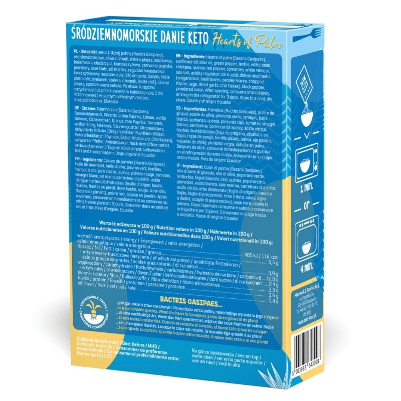 Keto posiłek z serc palmy będzie świetnym dodatkiem do Twojego jadłospisu, niezależnie od tego, czy jesteś na diecie ketogenicznej, jesteś weganinem, wegetarianinem, czy po prostu szukasz nowych, zdrowych opcji na posiłek. Stworzony z składników najwyższej jakości, bez dodatku GMO. Danie to łączy egzotyczny smak serc palmy z wyselekcjonowanymi przyprawami, zapewniającymi niepowtarzalne doznanie smakowe.