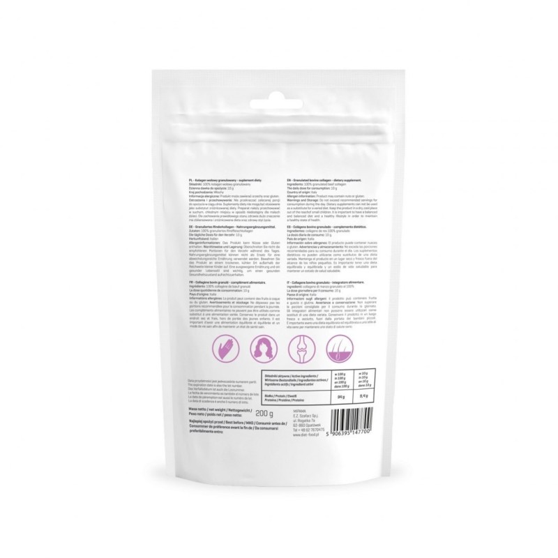 W jaki sposób mogę spożywać Kolagen? Dzienna dawka do spożycia: 10 g Polecamy spożywać go jako potreningowy shake, poranne smoothie lub z ulubionym napojem. Nie przekraczać zalecanej porcji do spożycia w ciągu dnia. Suplementy diety nie mogą być stosowane jako substytut zróżnicowanej diety. Preparat należy przechowywać w suchym, chłodnym miejscu w sposób niedostępny dla małych dzieci. Dla zachowania prawidłowego stanu zdrowia duże znaczenie ma zbilansowana i zróżnicowana dieta oraz zdrowy styl życia.