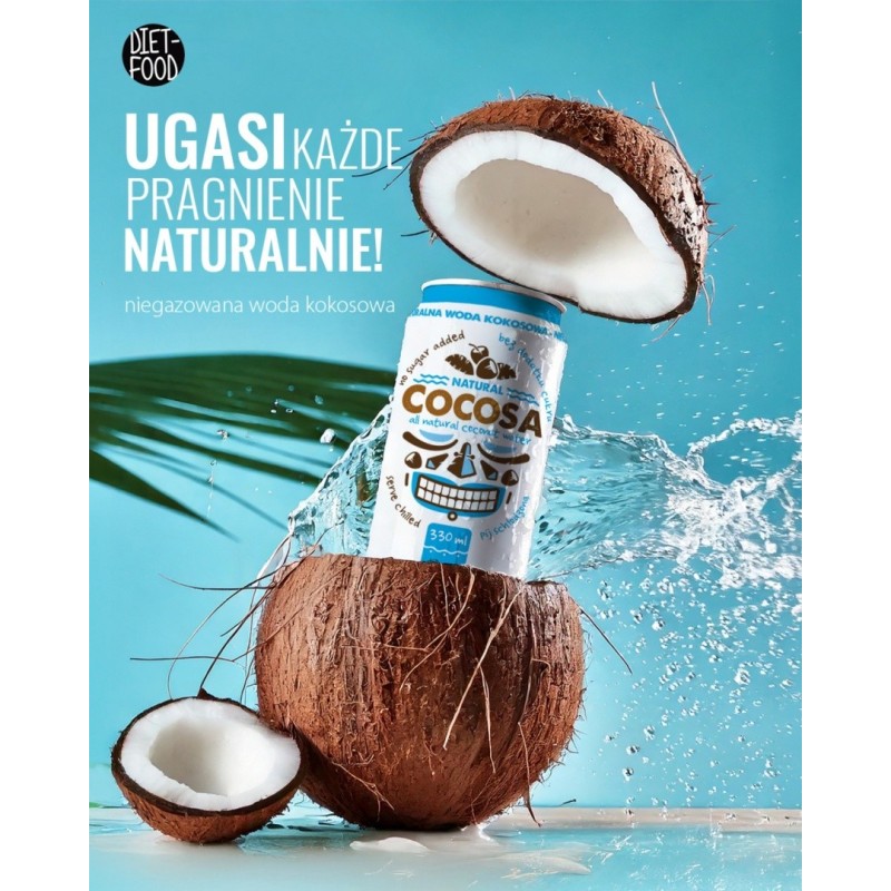 Naturalnie orzeźwiająca woda kokosowa ma słodki, kokosowy smak. Zawiera łatwo przyswajalne węglowodany w postaci cukru i elektrolitów. Nie mylić z tłustym mlekiem kokosowym ani olejem. Woda kokosowa to klarowny płyn wewnątrz owocu, który wylewa się z młodych, zielonych orzechów kokosowych. Doskonale gasi pragnienie dzięki elektrolitom. Jest to naturalny napój izotoniczny, który nawadnia po wysiłku. Świetnie sprawdza się również jako baza do drinków. Woda kokosowa ma mniej cukru niż wiele napojów dla sportowców i znacznie mniej cukru niż napoje gazowane i niektóre soki owocowe. Woda kokosowa może być świetnym wyborem dla dorosłych i dzieci szukających mniej słodkiego napoju.