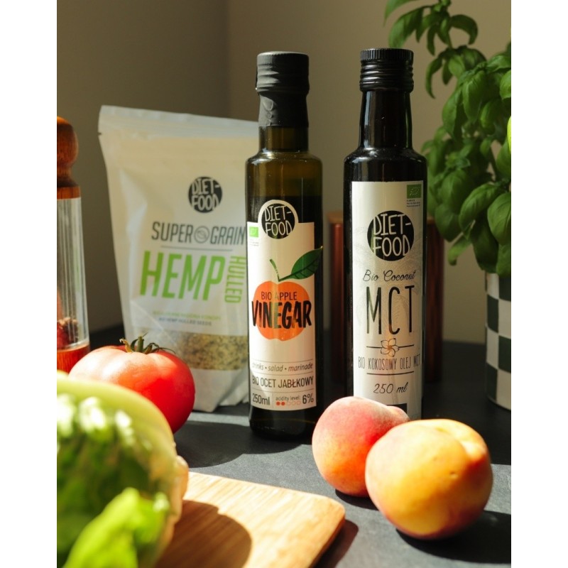 Uzyskiwany z naturalnej fermentacji wina jabłkowego. Ocet jabłkowy zdobył uznanie dzięki swoim właściwości zdrowotnym i oczyszczającym. Jest także niezastąpiony w kuchni. Bio ocet jabłkowy to idealny dodatek do sosów, dipów, mięs, jest świetnym dodatkiem do galantyn oraz różnego typów dresingów do sałat i sałatek. Idealny dodatek do konserwowania warzyw i owoców w popularnych domowych przetworach.