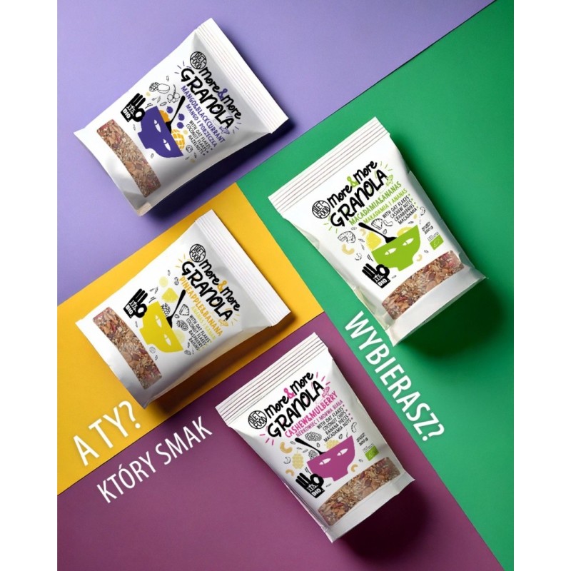 Granola More&More to jeszcze więcej granoli w jednym opakowaniu! Idealna dla tych, którzy nie mogą się nasycić smakiem pysznej, chrupiącej granoli. Każde opakowanie pełne jest naturalnych składników, które gwarantują pełnię smaku i najwyższą jakość. Granola More&More to doskonały wybór na zdrowe i pożywne śniadanie, do jogurtu lub jako przekąska w ciągu dnia. Więcej granoli, więcej smaku w każdej porcji!
