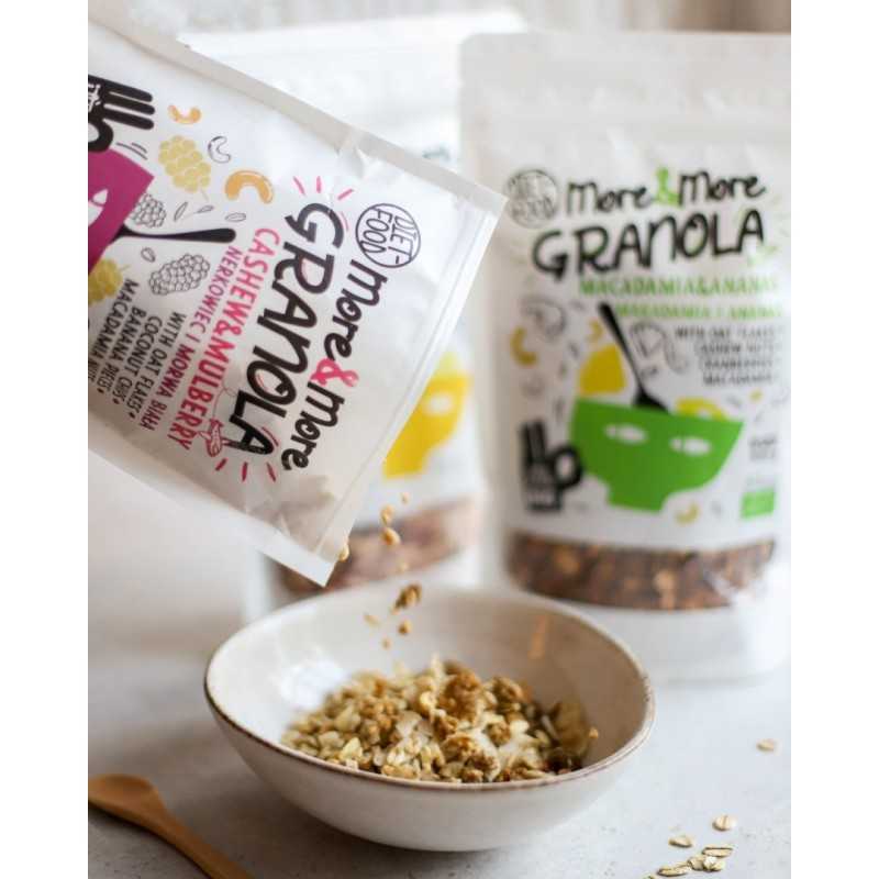 Granola More&More to jeszcze więcej granoli w jednym opakowaniu! Idealna dla tych, którzy nie mogą się nasycić smakiem pysznej, chrupiącej granoli. Każde opakowanie pełne jest naturalnych składników, które gwarantują pełnię smaku i najwyższą jakość. Granola More&More to doskonały wybór na zdrowe i pożywne śniadanie, do jogurtu lub jako przekąska w ciągu dnia. Więcej granoli, więcej smaku w każdej porcji!