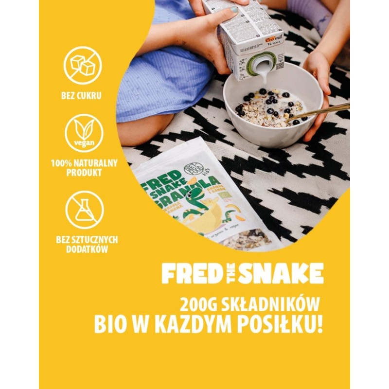 Granola Fred The Snake została stworzona z myślą o dzieciach. Wyprodukowana w 100% z naturalnych składników, które dzieciaki będą uwielbiać. Idealna na śniadanie, do jogurtu, czy jako słodka przekąska w ciągu dnia. Dzięki Granoli Fred The Snake, zdrowe jedzenie staje się przyjemnością, a każda chwila to okazja do pysznego i pełnowartościowego posiłku!